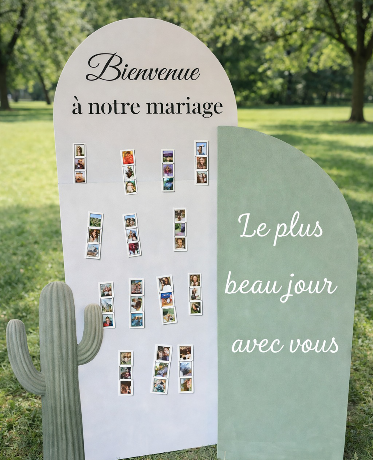 Apportez une touche élégante et chaleureuse à votre événement avec cet ensemble au design doux et moderne. Composée de deux panneaux aux formes arrondies (blanc et vert sauge), il est idéale pour accueillir vos invités et créer un espace photo unique et mémorable.