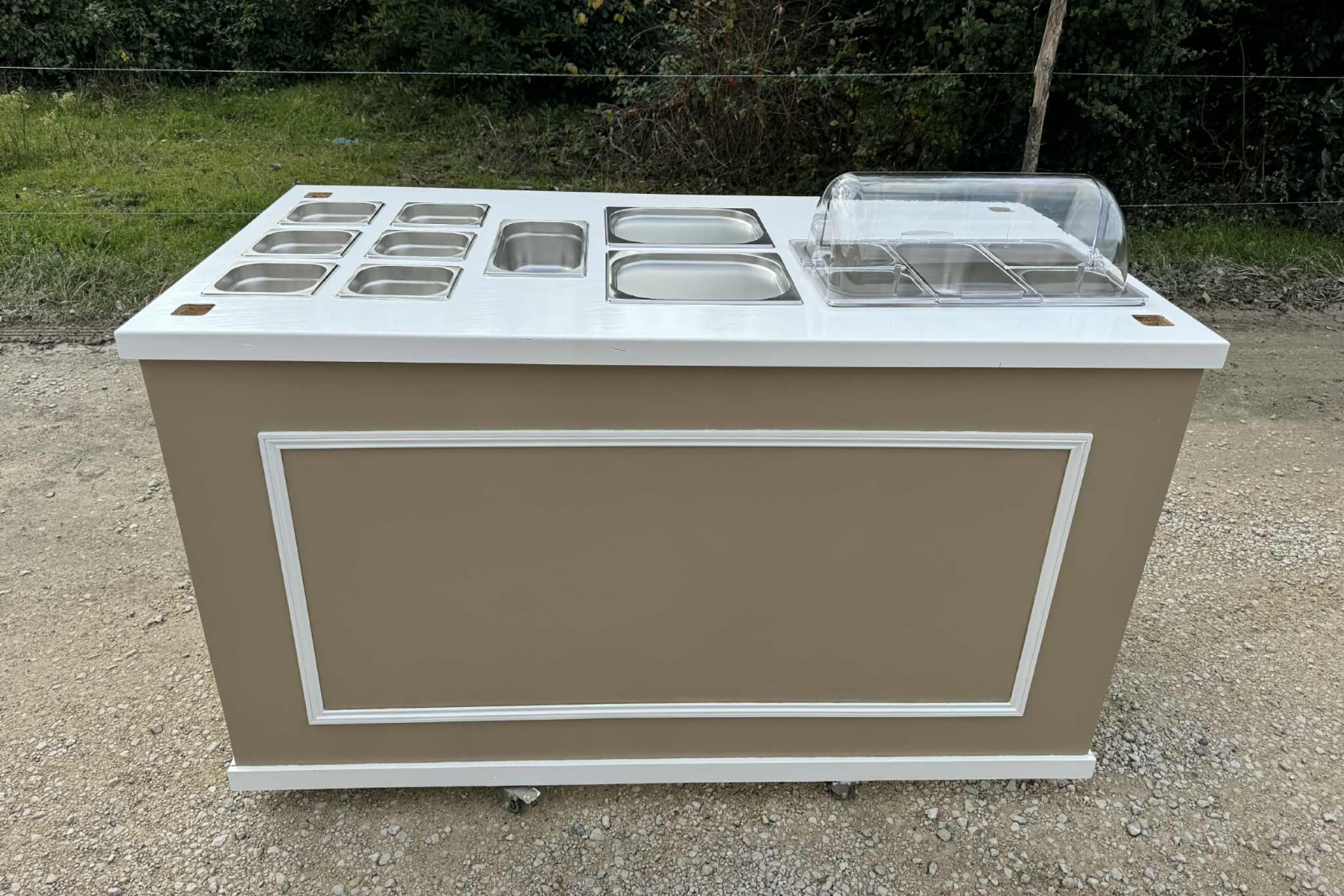 Imaginez un bar à bonbons la journée qui se transforme en présentoir à buffet le soir, grâce à notre second plan de travail équipé de caisses inox intégrées.