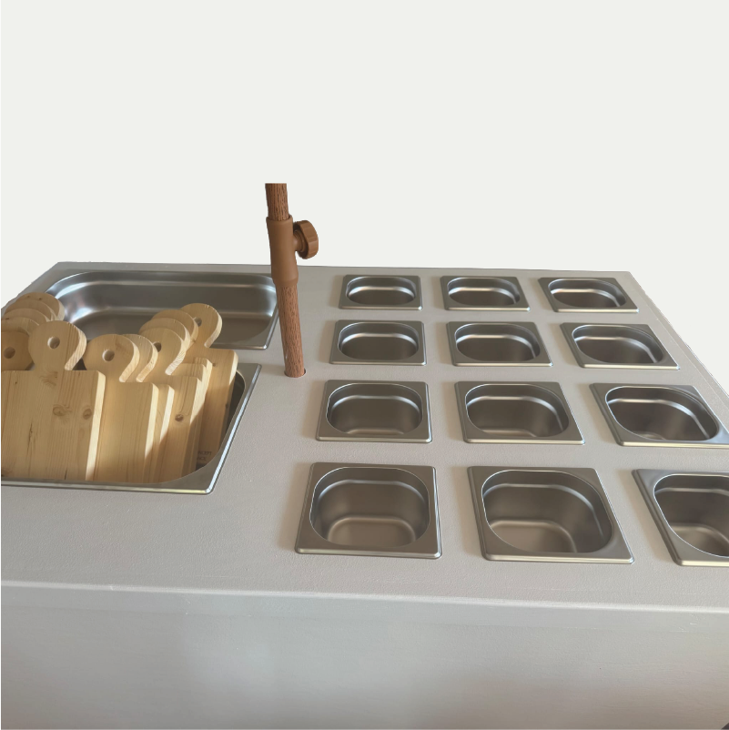 Fourni avec 12 bacs et des planches en bois, il offre une surface idéale pour disposer vos gourmandises, boissons ou accessoires de service.